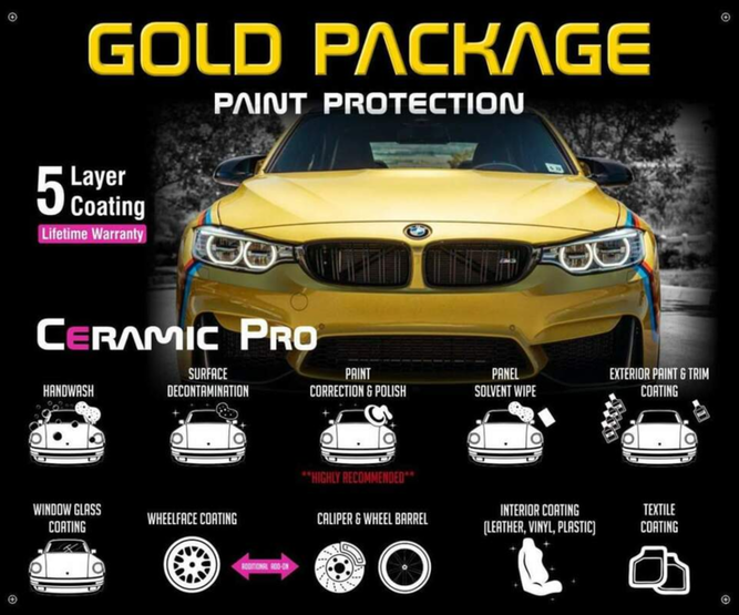 The Ceramic Pro gold package is our ULTIMATE choice for paint protection! Your paint will be protected with 4 layers of Ceramic Pro 9H and 1 layer of Ceramic Pro light as a top coat. The plastics on your vehicle will receive 1 layer of Ceramic pro 9H on rims and plastic, and 1 layer of Ceramic Pro Rain on all front side windows and windshield. This choice is perfect for for protecting your investment for many years to come, and it includes a lifetime warranty backed by car fax! This package will be a great defense mechanism for your vehicle to fight off whatever the harsh Phoenix elements has to throw at it such as dirt, bugs, bird poop, and mud. Your vehicle will be a breeze to clean and the hydrophobic properties are so insane that you can experience the ability of a full touch less car wash with the use of a DI water tank (spot free) and a air source to push the water beads off of your vehicle. The ceramic pro gold package is our recommended choice if you are going to drive your car "until the wheels fall off" and the perfect combination with it would be our popular full frontal clear bra package with Kavaca paint protection film. So not only your paint will be protected with a ceramic coating, but also a clear glossy film will be protecting your full hood, bumper, fenders, headlights, and mirror caps will be protected from the destructive rock chips we are so used to on the Phoenix highways. Contact us today for a free quote, and paint correction spot.